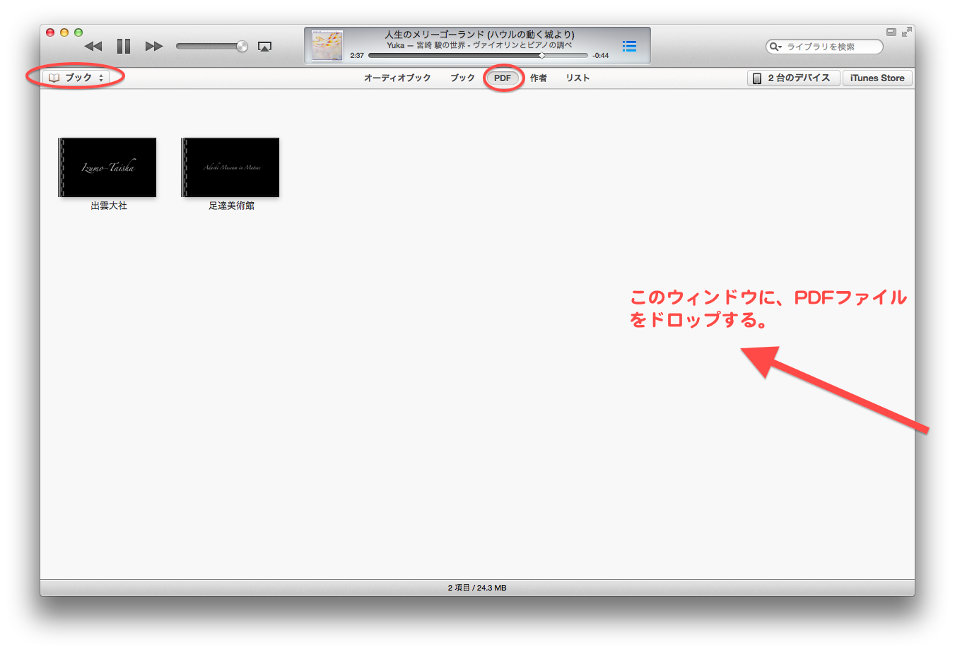 「パソコンのiTunesに「ブック」として取り込みます。(iTunesにPDFファイルをドラッグ&ドロップしてください」