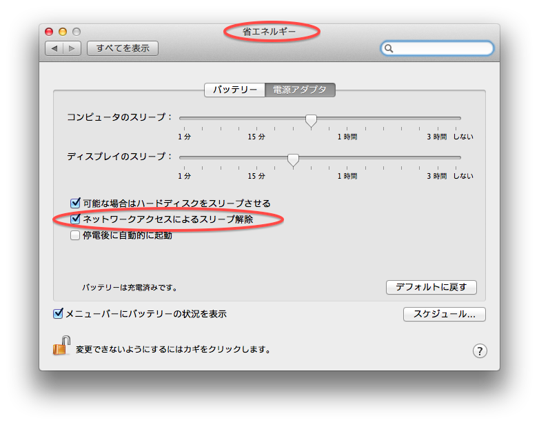 システム環境設定の省エネルギーの「ネットワークアクセスによるスリープ解除」は、有線接続した場合とAirMac機器(AirMac Express / AirMac Extreme / Time Capsule)を利用した場合に機能する仕様なので、現状の運用では、この項目にチェックが入っていても、機能しません。