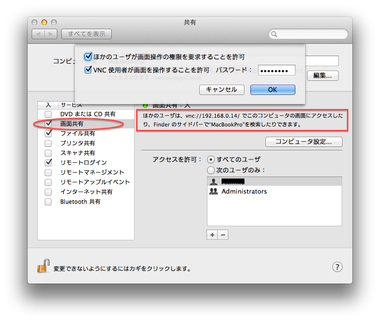 imacとmacbookAirを画面共有したいのですが、imac側からmacbookへの画面共有は