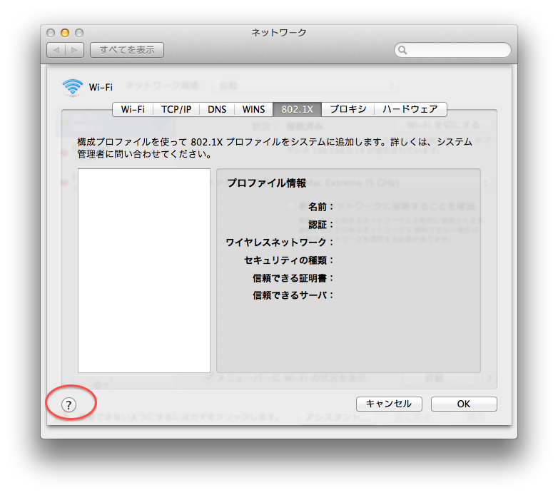 Wifiの詳細の802.1Xですが、特に何も設定していません。というか+ーボタン等も表示されておらず「キャンセル」「OK」「?」以外押せそうなものがありません。Control + 右クリックでもメニューがでる気配がありません。