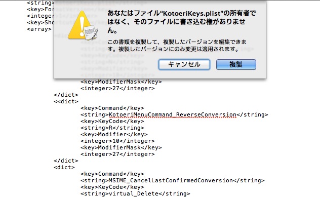Terminal.appでpicoや、vim、emacなどのエディタをスーパーユーザーで起動すると、ログインパスワードの入力の後、編集可能な状態になります。 例えば、sudo pico KotoeriKeys.plist のコマンドを実行します。