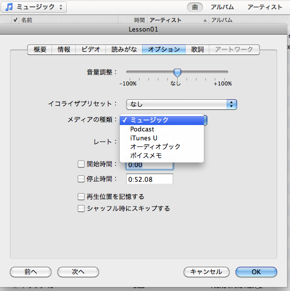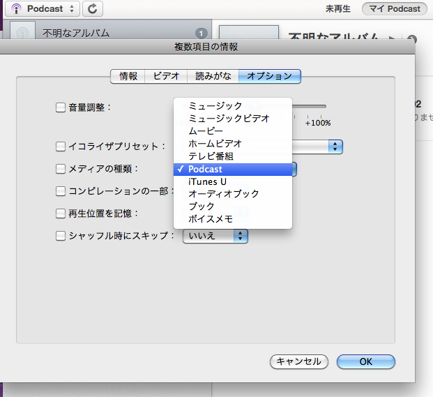 もう一度、編集→情報を見ると、ムービーを選択したはずなのに、勝手にpodcastになってました。