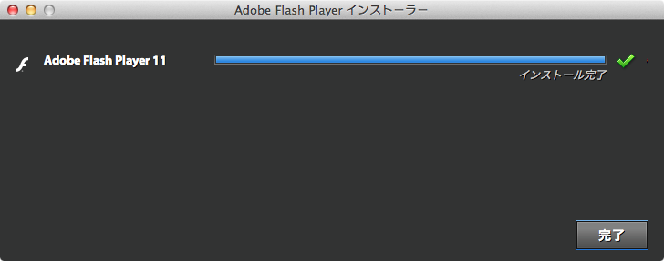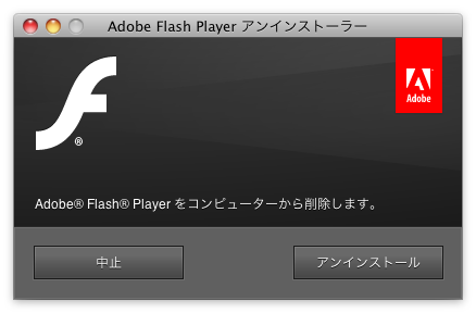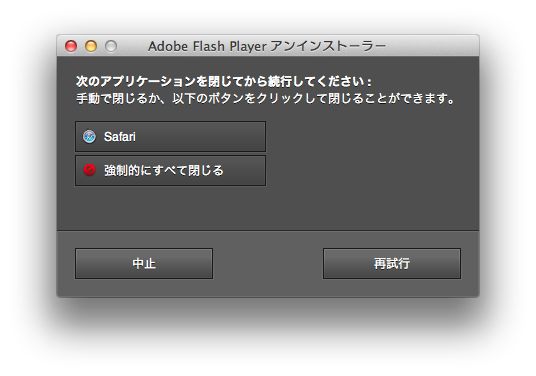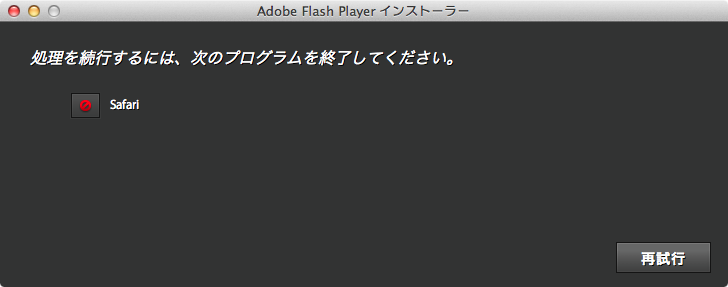 OS X 10.8.4 (Build 12E55) [Mountain Lion] の環境下で Adobe Flash Player の新しいバージョンがあるとのメッセージが出たので、Adobe Flash Player 11.8.800.94 (20130709) をダウンロードしてインストールを開始しました。しかし、インストール途中で「処理を続行するには、次のプログラムを終了してください」というメッセージが出てしまいます。