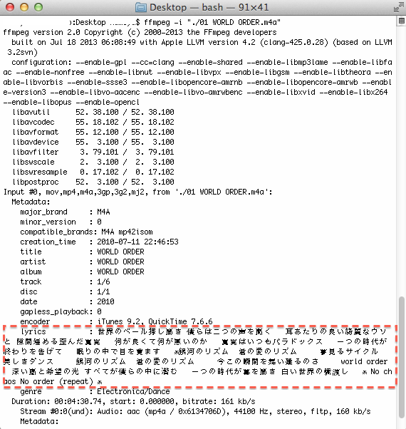 上のはffmpegでm4aファイル(iTunesでaacエンコーディング後に歌詞を自分で入れた)の歌詞を表示させた例です。