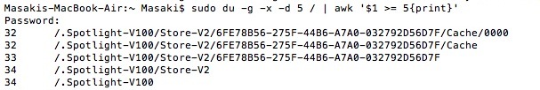 それでも0にならないなら、下記のコマンドを実行して一旦 /.Spotlight-V100 を削除するのがいいと思います。