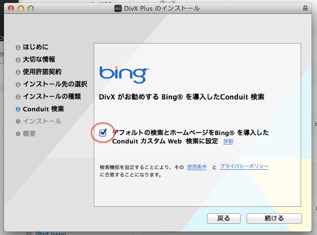 なお、DivXのインストーラで「Couduit 検索」の項目が出ないのは、既にBingを使う設定で一旦インストールしてしまっているからでは?
