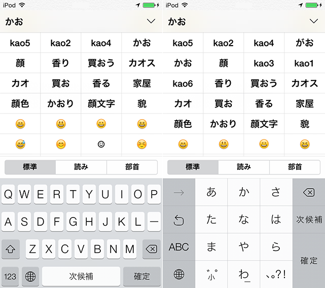 #よみを「かお」として、kao1からkao6までを辞書登録したときの左が「ローマ字入力」時、右が「かな入力」時の変換候補の表示です。