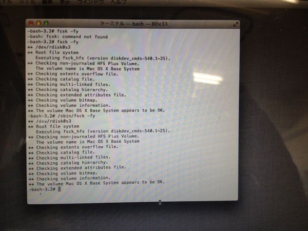 写真のfsckは、内蔵のシステムボリュームじゃなくて単に復旧ディスク(のメモリーイメージ)に対して行っているだけですね。