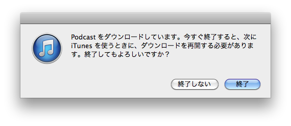 ユーザのユーザプロフィール: kimukazu kimukazu ユーザレベル: レベル 2 179 ポイント 2013/10/13 01:02 isao33 への返信 こんにちは私も、iTunesを終了する場合に、以下のメッセージが現れ、終了ボタンを押しても終了できないという類似の現象に遭遇したことがあります。 しかしながら、私の場合は、問題となるPodcastのコンテンツ(ダウンロード中のもの)を削除することで、iTunesが正常に終了できるようになりました。参考になれば幸いです。ご指摘の情報が少なく、もし、まとはずれなコメントでありましたら、ご容赦ください。動作環境:-Mac OSX 10.6.8 SnowLeopard-iTunes 11.1.1(11) 返信 リンク