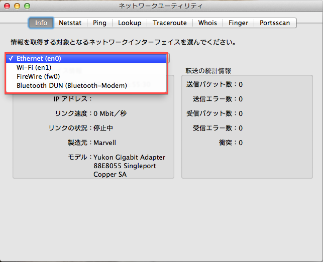 「info」タブの「情報を取得する対象となるネットワークインターフェイスを選択してください。」の