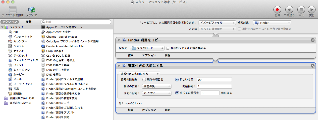 なお、当方の環境は Snow Leopard なので、Lion 以降では Automator の文言が多少異なるかもしれませんので、その辺は適宜読み替えていただければと。