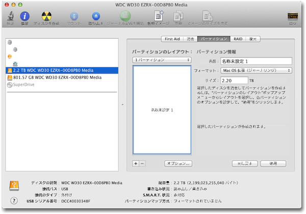 ディスクユーテリティではフォーマット前の状態で、2.2TBと800MBの2つのディスクとして認識されます。