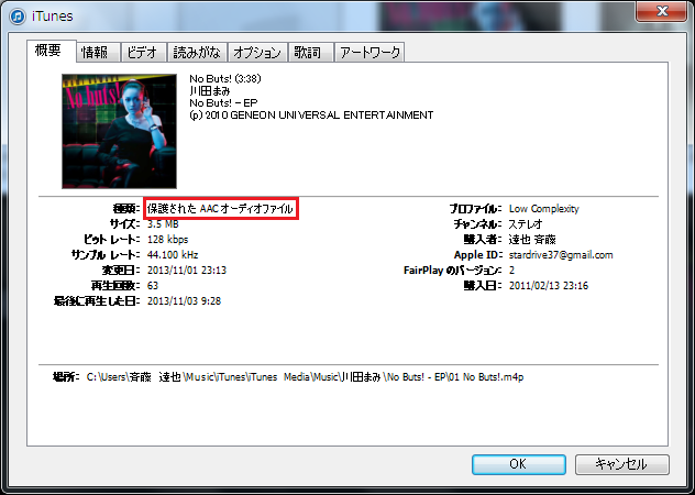 その曲を購入した時点では「保護されたAACオーディオファイル」(俗に言うDRM付き)での販売だったんでしょうね。その後保護無しへのアップグレードサービスが有ったんですが、もう終了しています。