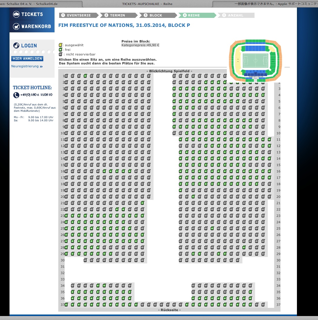 しかし、Safari ではブロック指定では会場の画像のみしか表示されません。一応ブロックの指定はできますが、座席指定に移ると一瞬、座席指定の表示が出るのですが、すぐに表示が切り替わって会場の小さい画像のみの表示となります。