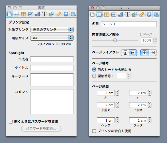 Numbers に限らず、iWork アプリケーションは「インスペクタ」の扱いがキモとなるようです。印刷物出力機能を持つアプリケーションには、[ファイル]メニューの項目に [用紙設定] などがあり、ここから用紙サイズや印刷可能領域の設定などを行うものが多いのですが、iWork アプリケーションではこれらの設定が「インスペクタパネル」に集約されています。さらに、同じ iWork アプリケーションでありながら、Pages、Numbers、Keynote ではそれぞれインスペクタパネルで設定できる内容に若干の違いがあるということにも気をつけなければなりませが、これについては後ほど少しだけ触れます。Numbers のコミュニティに投稿されているので、まずは Numbers でのアプローチを説明します。