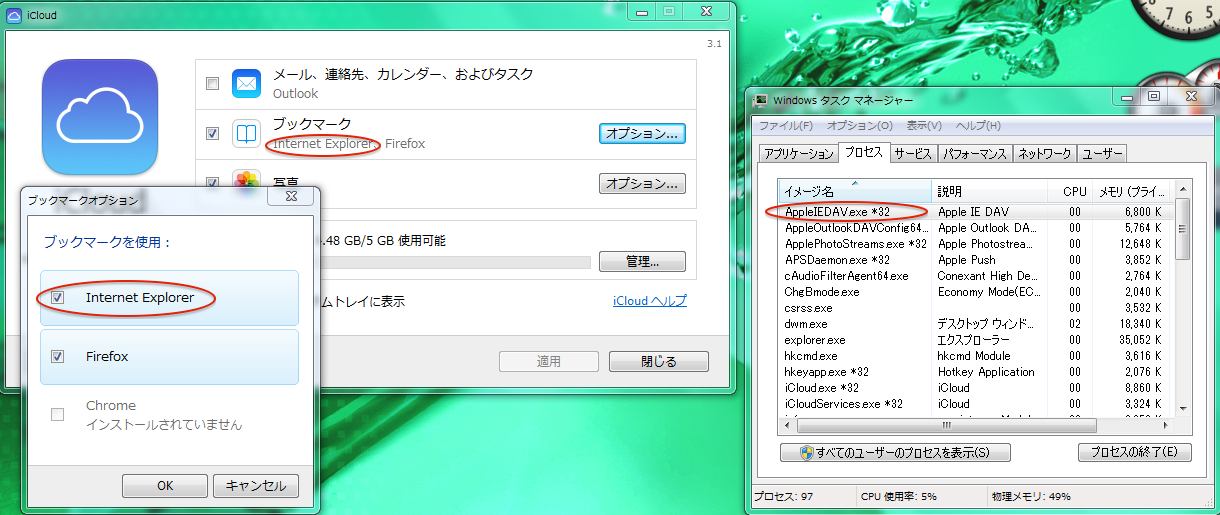 「Apple IE DAV」というのは、iCloudコントロールパネルのInternet Explorerブックマーク同期に関連したプロセスです。「iCloudコントロールパネル」でInternet Explorerのブックマーク同期をオンにするとプロセスが起動し、同期をオフにするとプロセスは終了します。
