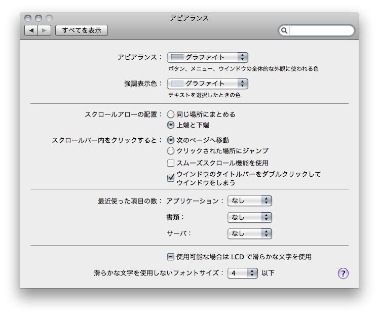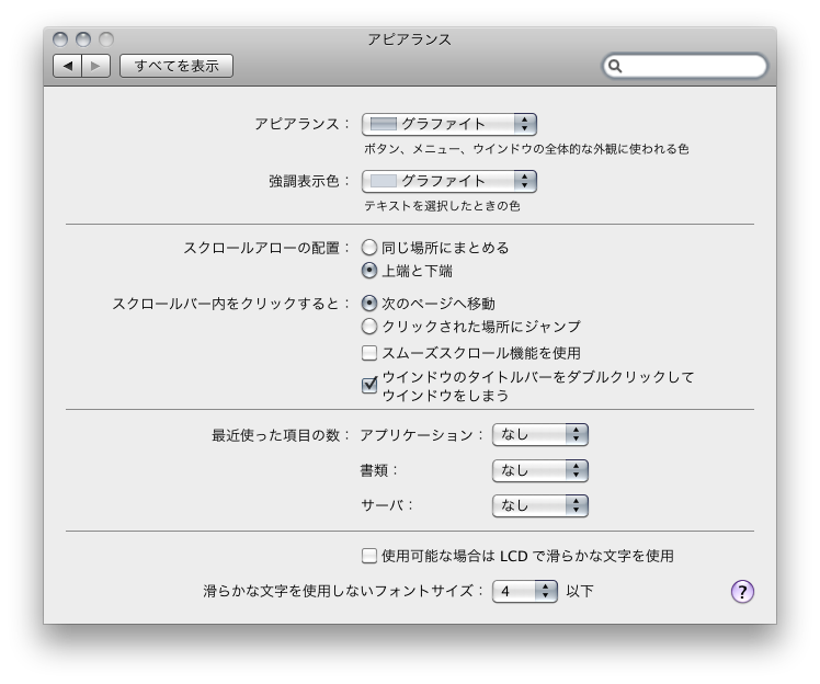 これで Snow Leopard の見え方にかなり近づいたと思います。あとは、先のコメントの繰り返しになりますが、環境設定ウインドウのような GUI の部品に使われる「かな/カナ」のフォント。これは慣れるしかありません。