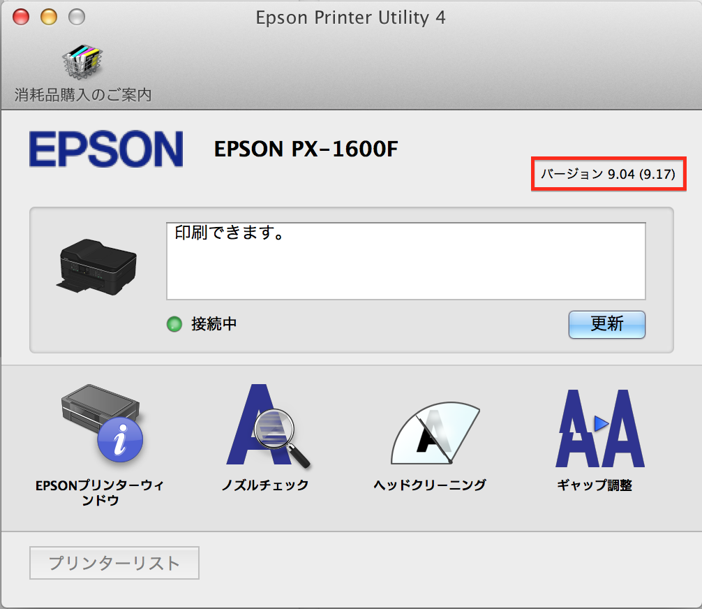 ちなみに下の画像は、EPSON PX - 1600F のユーティリティソフト「Epson Printer Utility 4」のものですが、赤枠の中の 9.04 は