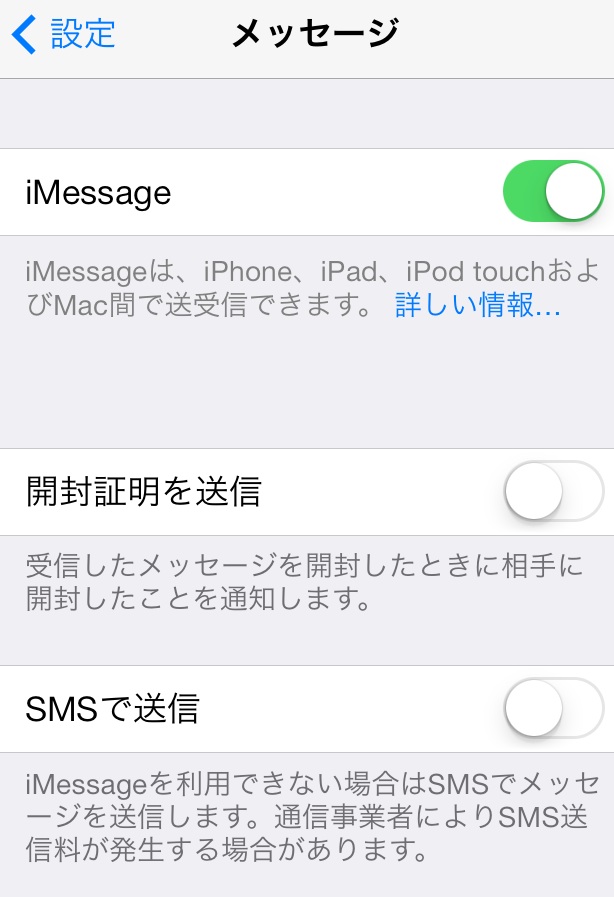 私はこの説明をみて、この機能をoffにしておくと、iMessageが使用できない相手、例えばガラケー使用者やiPhoneだけどiMassageをoffにしている人に、「メッセージ」を使用してショートメールを送る場合は、警告が出て送れないものだと勘違いしていました。