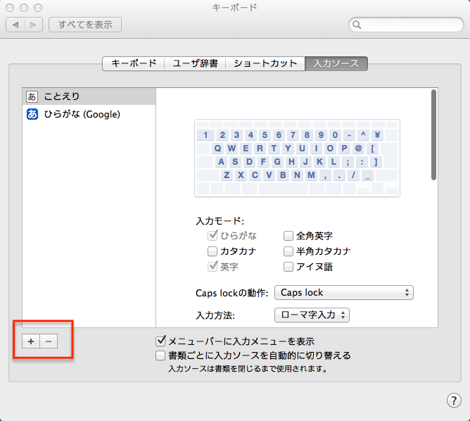 「+」ボタンをクリックして、「U.S.」等の外国語の入力ソースを追加する事で「ー」ボタンがアクティブになります。