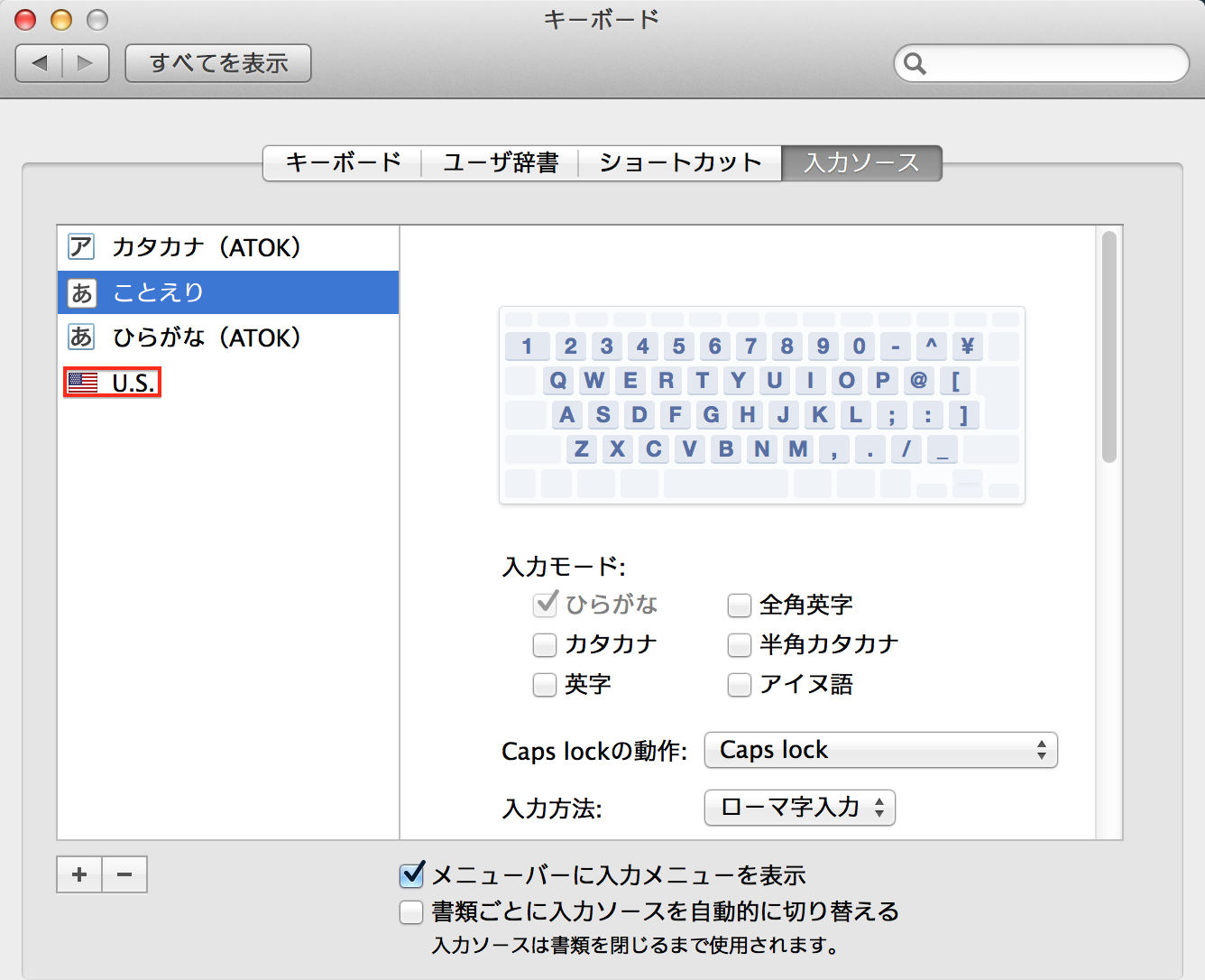 してからは、「ことえり」を削除する為に「U.S.」を追加している為、英字(ATOK)の方を削除しています。