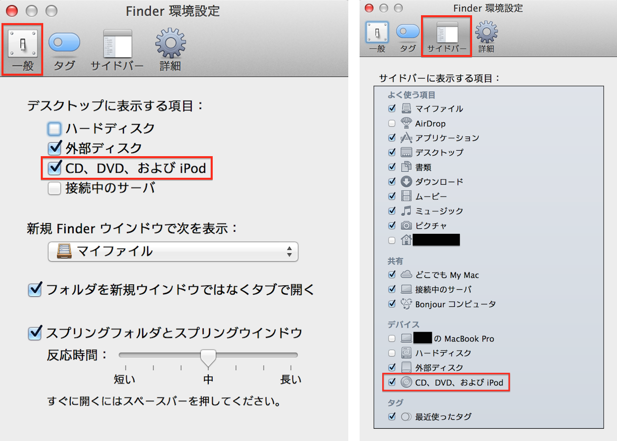 また、「Finder」>「Finder」メニュー >「環境設定」>「一般」タブと「サイドバー」タブの赤枠のチェックボックスに