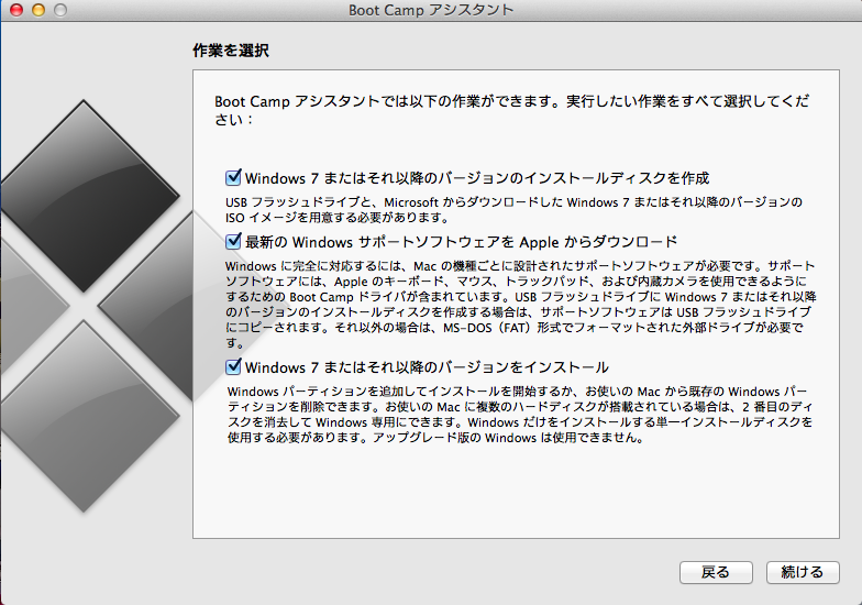 ただ、ブートキャンプアシスタントを開き、インストール画面で「続ける」のボタンを押下すると