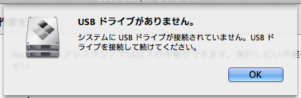 「USBドライブがありません。システムにUSBドライブが接続されていません。USBドライブを接続して続けてください。」