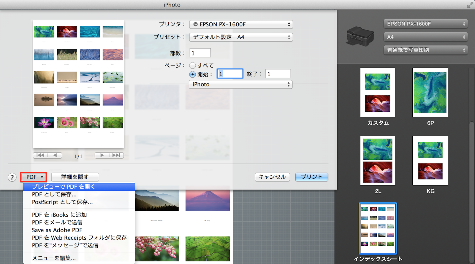 また、PDF で保存したインデックスシートを「iPhoto ライブラリ」に読み込む場合は、インデックスシートを