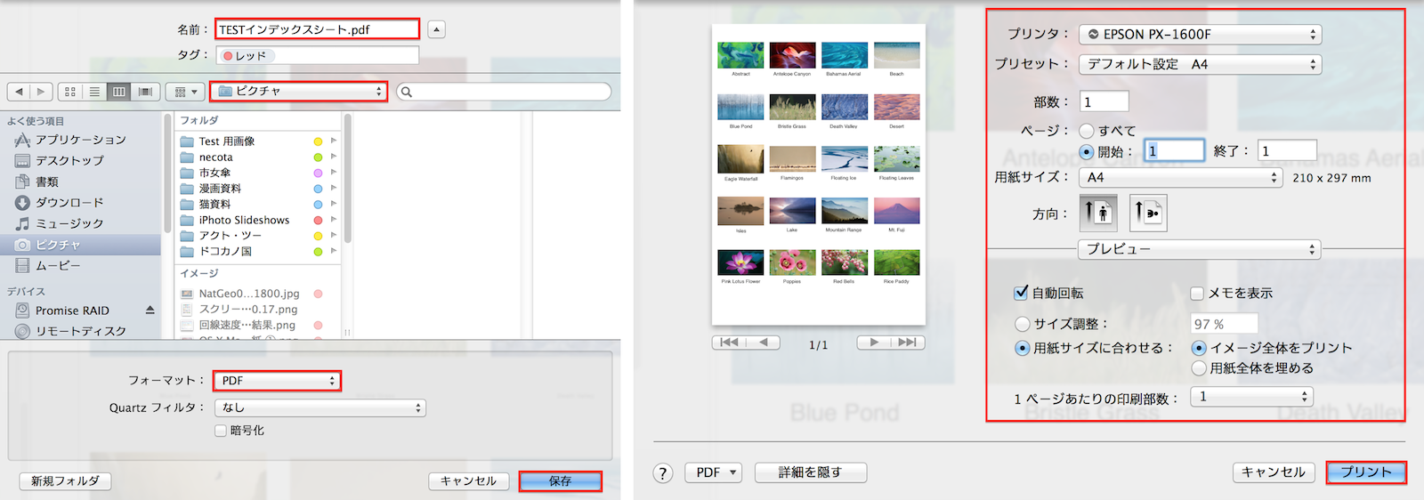 「プレビュー」で開き、「ファイル」メニュー >「書き出す」でインデックスシートに名前を付けて保存する際に、