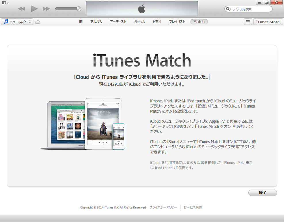 ステップ1が終了すると、「iTunes Matchが利用できるようになりました。」と表示