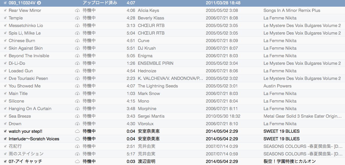 (補足)検証に用いた楽曲ファイルのうち、未発売の特典サウンドトラックを除き、母艦iMacのライブラリでiTunesMatchを不完全ながら実行済みです。