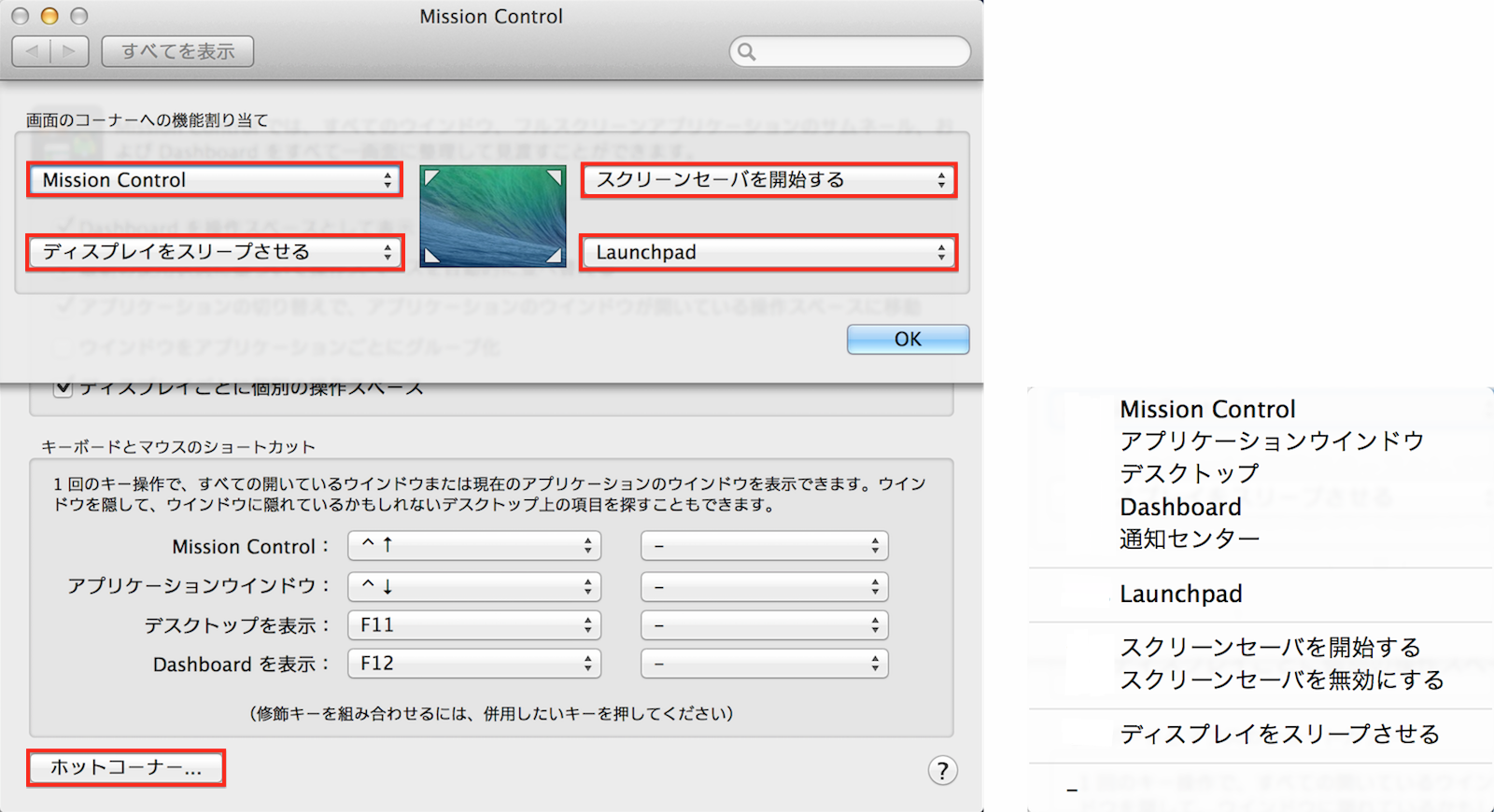「Apple」メニュー >「システム環境設定」>「Mission Control」ウインドウの左下に有る「ホットコーナー」ボタンをクリックして、