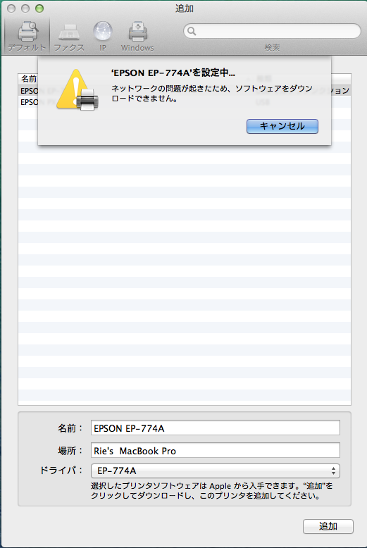*Macが自動検出、『追加』をクリックするが、どちらのプリンターも下記アラートが出てダウンロードできず。(アラート:ネットワークの問題が起きたため、ソフトウェアをダウンロードできません)