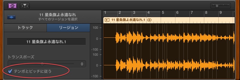 私のだとこのタイムクオンタイズメニューがなく、テンポとピッチに合わせるという選択肢自体がありません。リージョンのところにはトラック名と逆再生の選択肢しかありません。