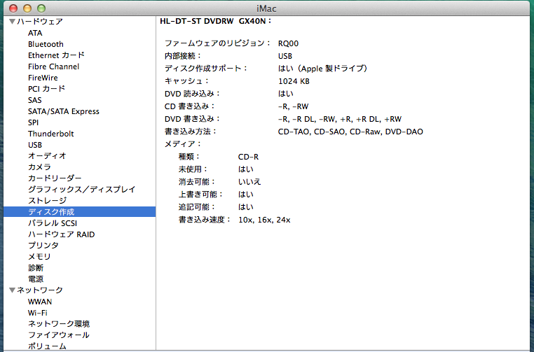 マーク>このMacについて>詳しい情報>システムレポート>ディスク作成。