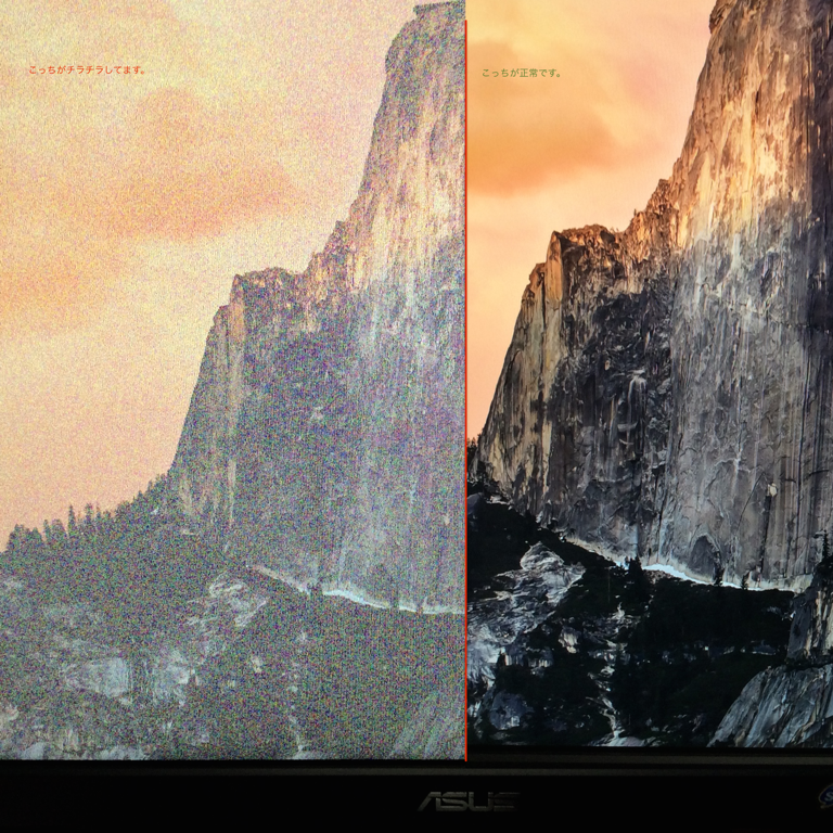 左側が希に復帰した時になる症状です。そして一度スリープさせ復帰すると元に戻りますが、macを使用しているとどのタイミングなのか解らないのですが、チラチラになってしまうことがあります。