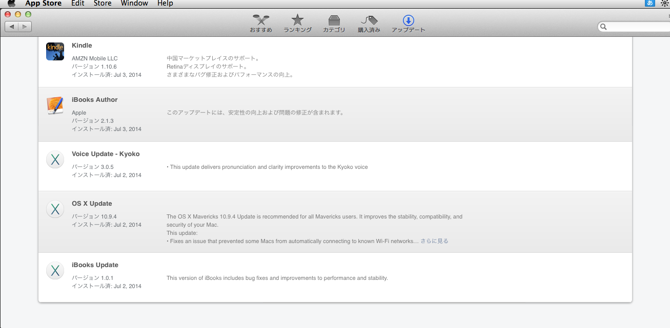 内蔵ドライブを外付けドライブにコピーして「OS X 10.7.5」起動ドライブを作成して、そのドライブに「mavericks, OS X 10.9.3」を上書きして様子を見ていました。問題は無いので7/2に「OS X 10.9.4」にアップデートしました。特に問題はありませんでした。