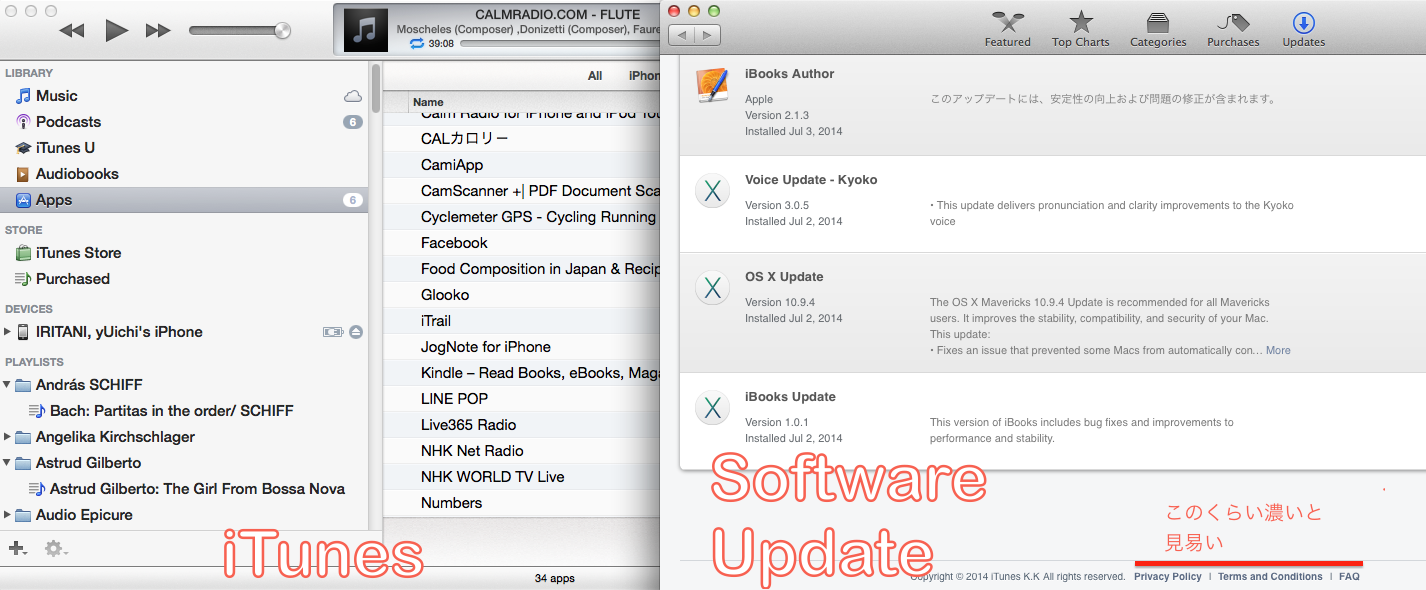 内蔵ドライブを外付けドライブにコピーして「OS X 10.7.5」起動ドライブを作成して、そのドライブに「mavericks, OS X 10.9.3」を上書きして様子を見ていました。問題は無いので7/2に「OS X 10.9.4」にアップデートしました。特に問題はありませんでした。