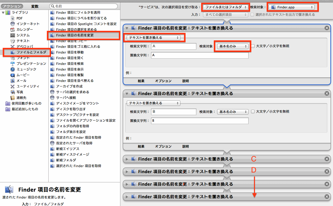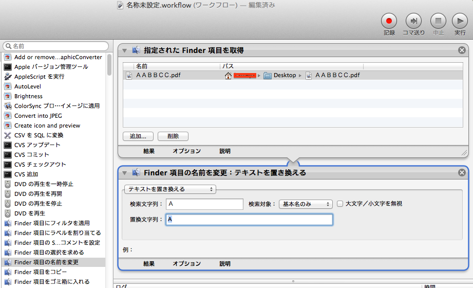 『Finder項目の名前を変更』アクションで、『テキストを置き換える』を選択して、全角のAを検索文字列に入れ、半角のAを置換文字列にいれます。