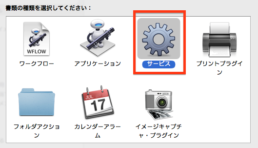 失礼致します。 まず、Automatorのファイルメニューから新規作成を選択して、表示されるダイアログから『サービス』を選択します。