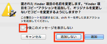 次に、左の『アクション』>『ライブラリ』から、『ファイルとフォルダ』にある『ファインダー項目の名前を変更』アクションを選択して、右側のワークフローにドラッグ&ドロップします。 コピーを作るかどうか聞いてくるので、『今後このメッセージを表示しない』にチェックを入れて、『追加しない』を選択します。