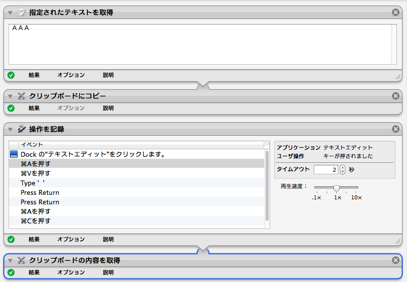 小文字のアルファベットも置換する場合はさらに、26個のアクションを、全角の数字を半角に置換する場合は、さらに10個のアクションを追加することになります。 かなり面倒ですね。