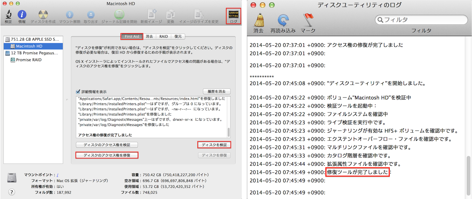 「ディスクを検証」で、いつまで経っても結果が表示されない場合は、ウインドウ右上の「ログ」アイコンをクリックして
