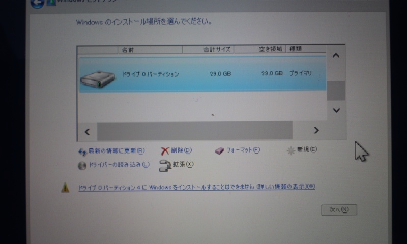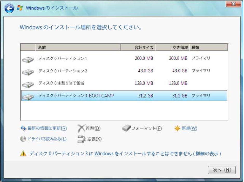 BootCampでWindows8.1_64bit通常版をインストール中ですが、どうにも先に進めません。Macbook Pro retina, 13-inch, Late2013、2014,6月購入です。WindowsのISOイメージも作りました。USBのフォーマットはMS-DOS(FAT)です。進めていくと次の画面で止まります。