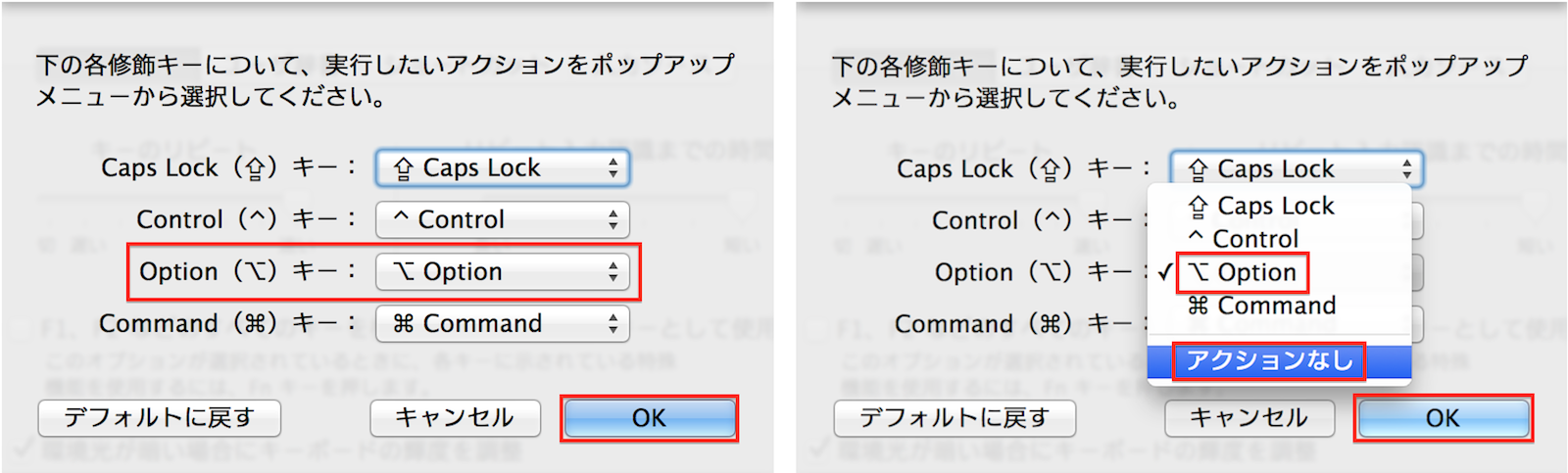 再度 「修飾キー」設定ウインドウを表示させ、「Option キー」の設定を「Option」に設定し直し、「OK」ボタンを