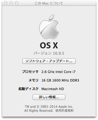 試した内容は10.9.4から10.9.5へのアップデート、ディスクユーティリティーからディスクの修復、アクセス権の修復、OSの再インストールです。