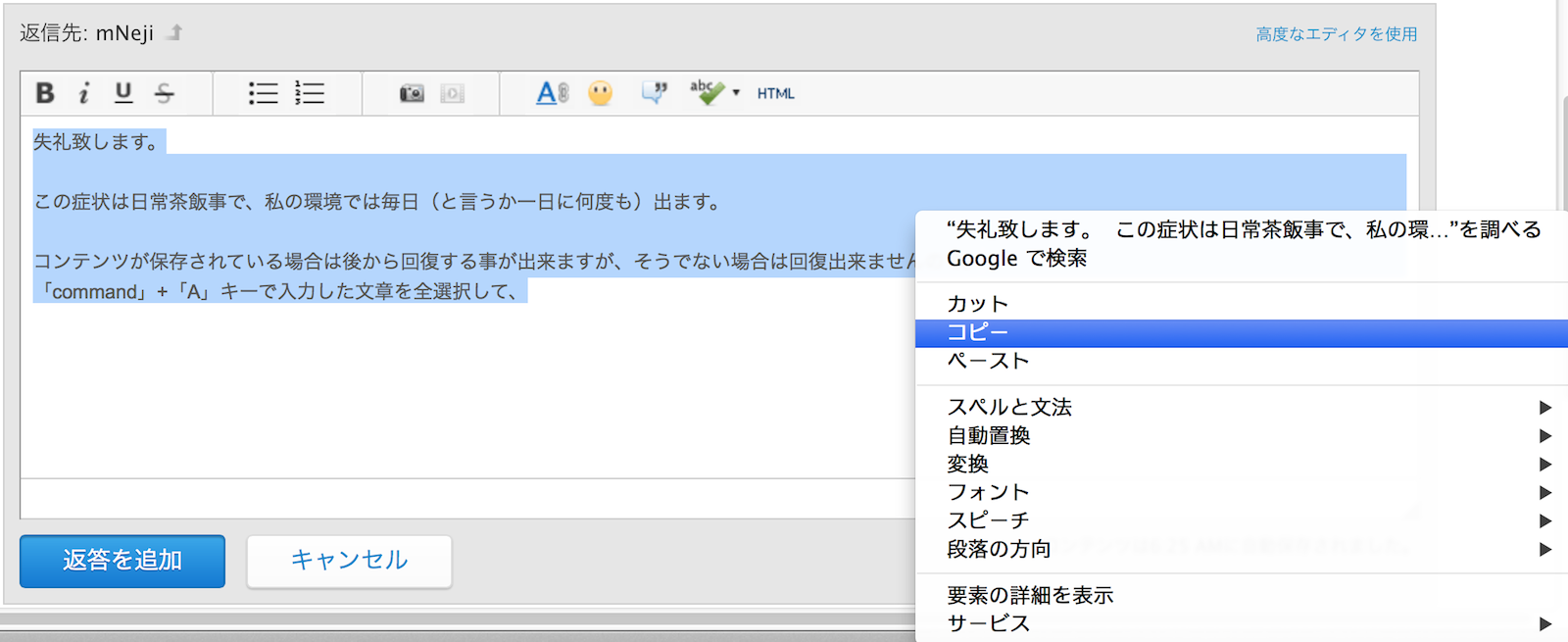 「エラーのため、コンテンツを保存できませんでした。」と出て、返信ができません。