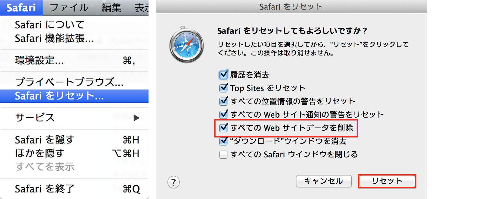 して「Safari」メニュー >「Safari をリセット」で「すべての Web サイトデータを削除」にチェックを入れ、