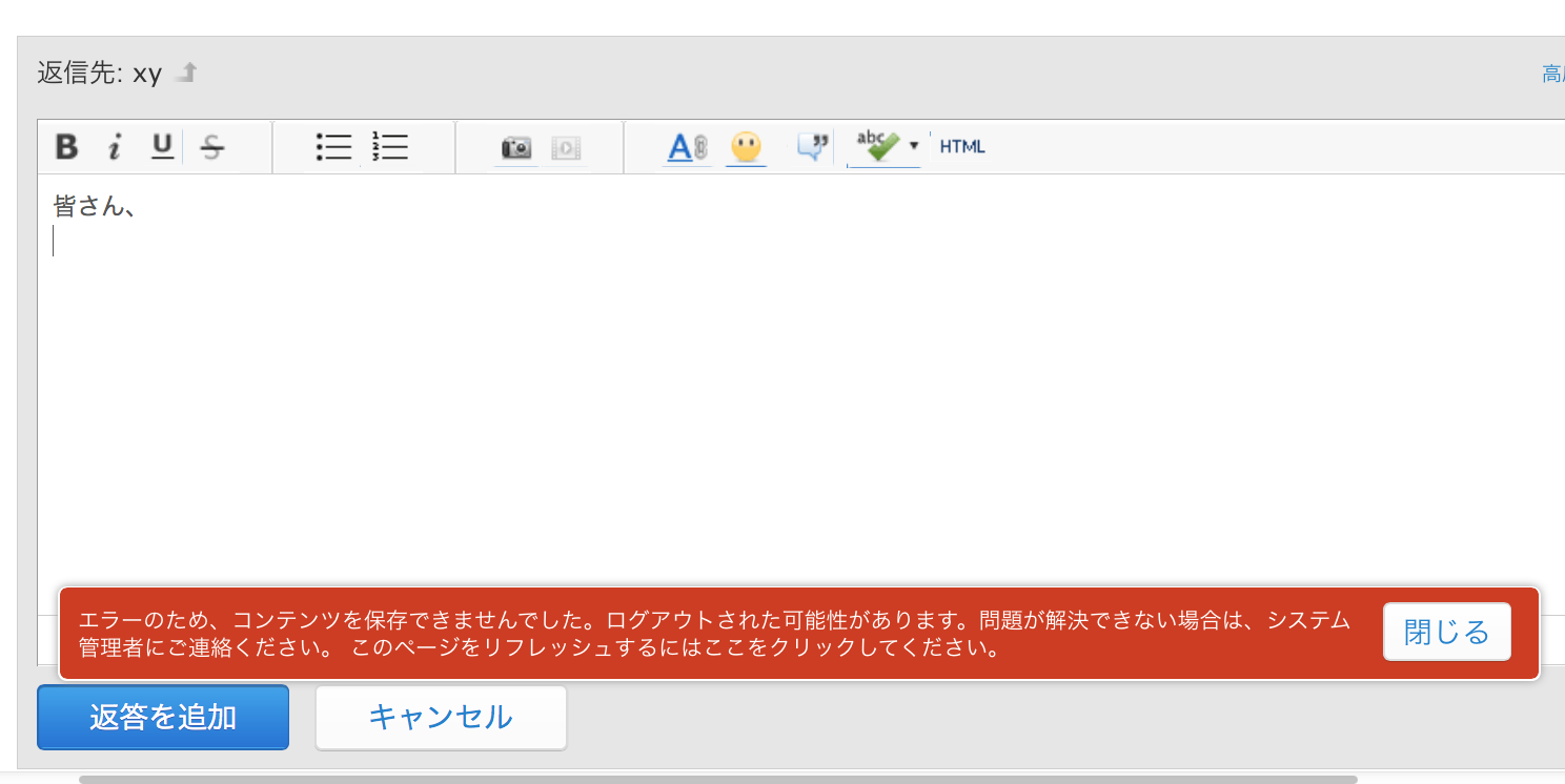 「エラーのため、コンテンツを保存できませんでした。」と出て、返信ができません。